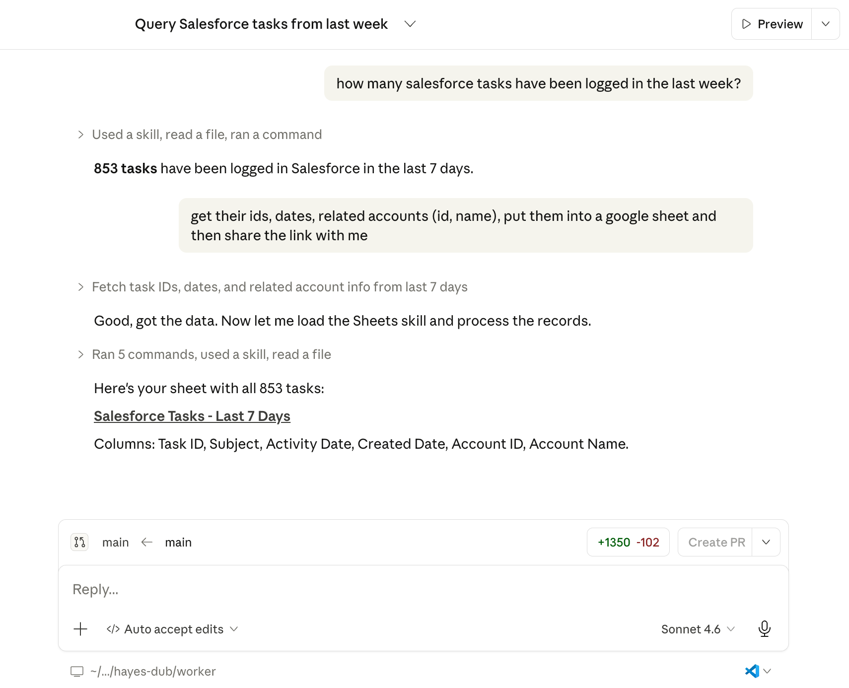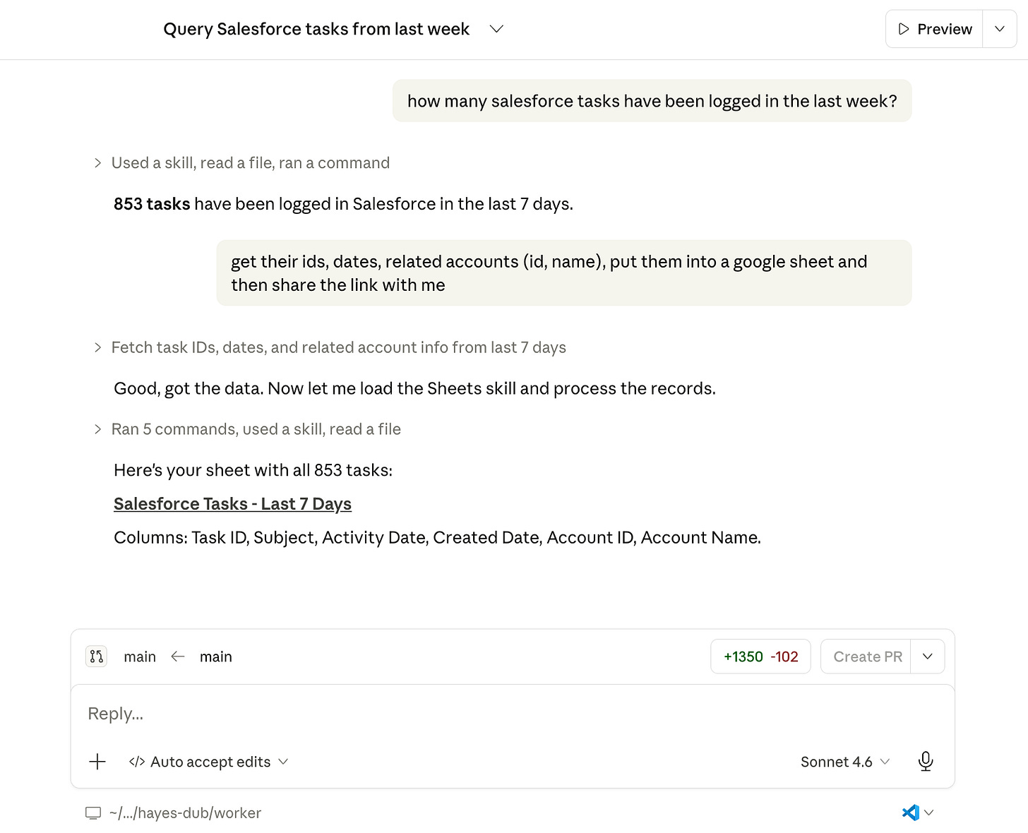That “sales assistant” with a “pipeline brain”? It’s a skill in my personal agent that hits several different data sources (via our CLI—more on that below) and updates some markdown files with the current state of all our deals. It’s not rocket science, but it is genuinely useful.