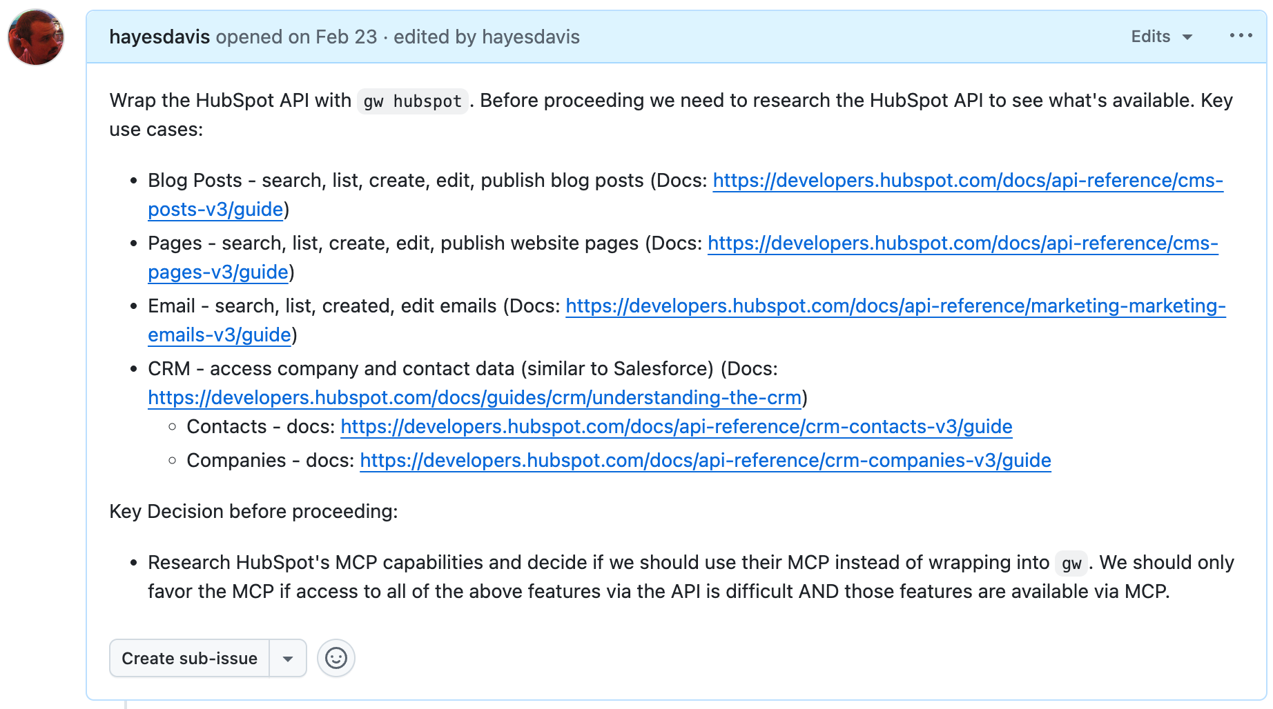 For example, here’s the initial description I gave Claude to build the HubSpot part of our CLI: