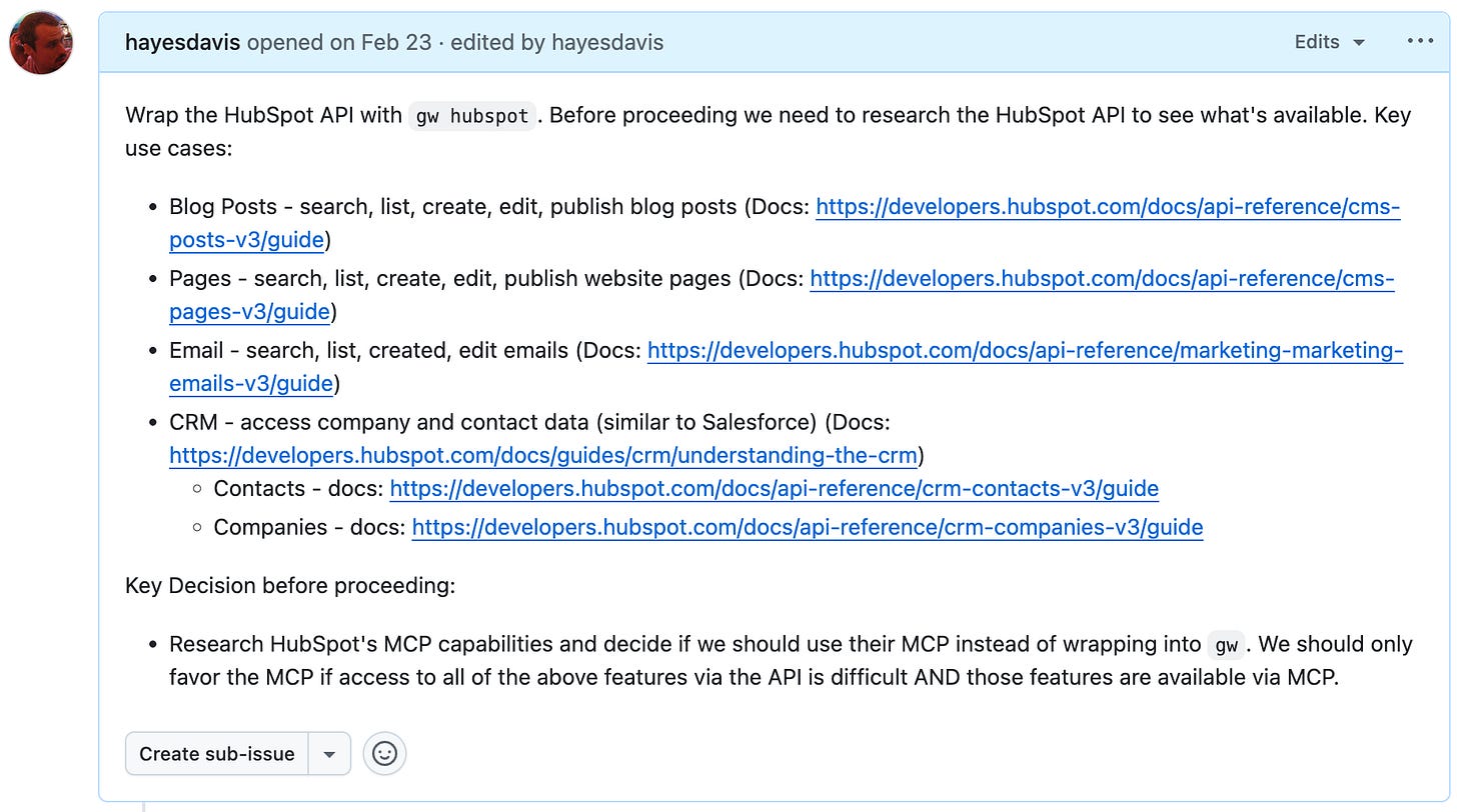 The gw CLI gives us full control over what features and functionality we want to expose to our agents instead of being at the mercy of a vendor-provided MCP.