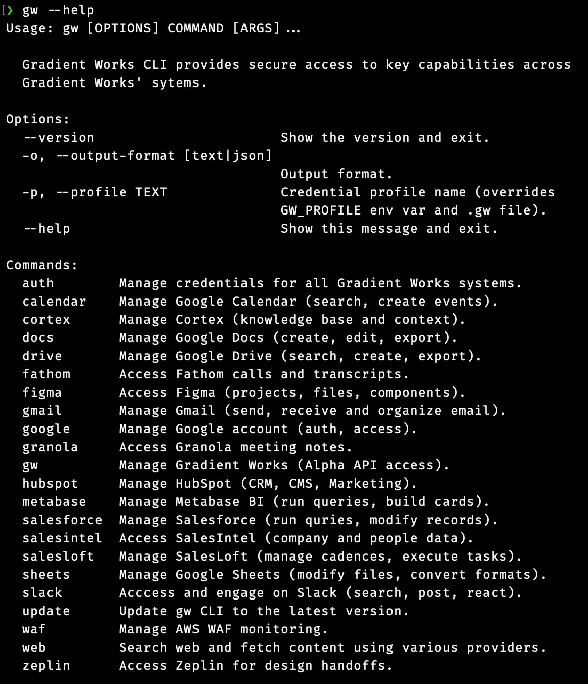 --field "Website=acme.com"The gw CLI currently integrates with 18 different systems we use to do our work, from Google Calendar to Zeplin. You can see them here: