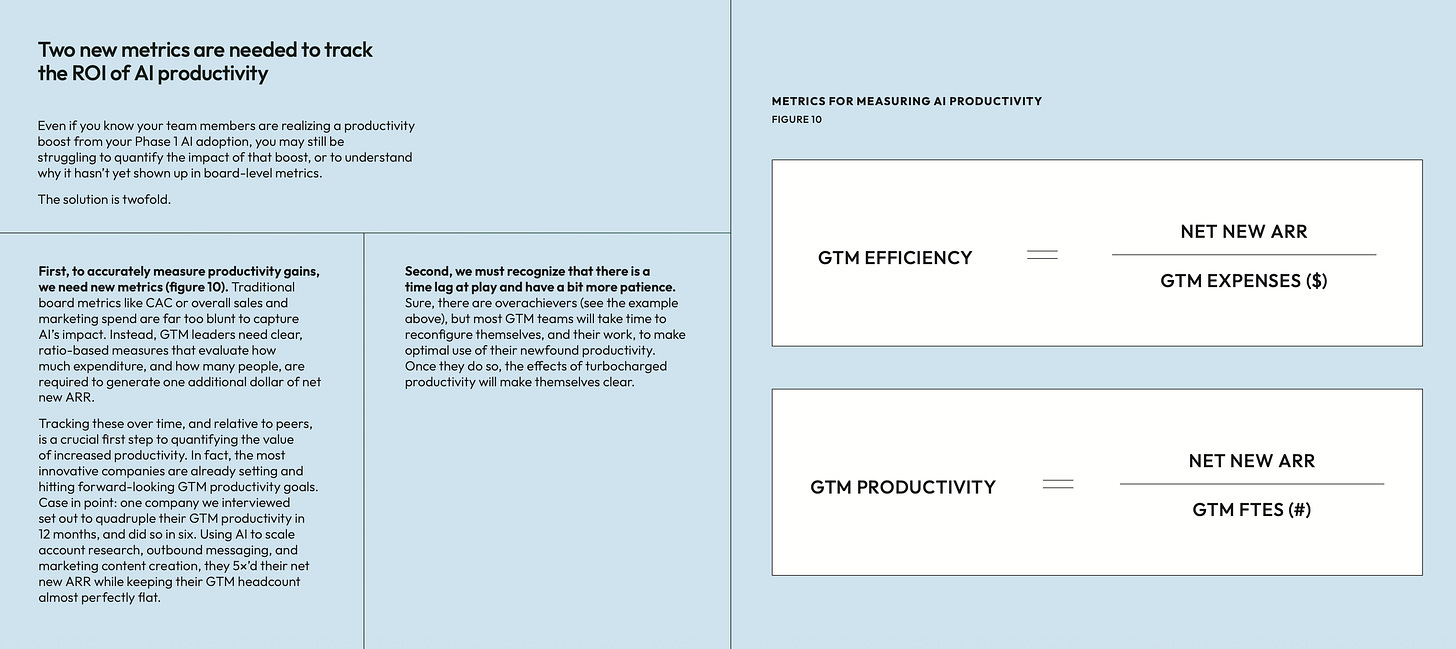 Ultimately, Kristina sees AI adoption as a process of stacking gains on top of gains. Each individual gain might not be obvious, but the aggregate effect can be large. Scale is recommending two metrics to measure this holistic impact: GTM Efficiency and GTM Productivity. You can see those defined below: